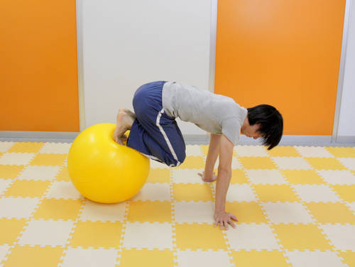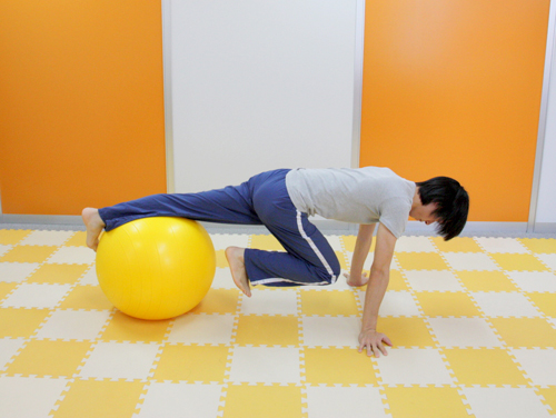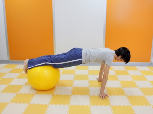 1. 膝下までをバランスボールの上にのせ、両手でしっかり地面を押します。この時、背すじを真っ直ぐにする事を意識していきましょう。お腹を出さないように、お腹をしっかり引き締めていくことも忘れないように!